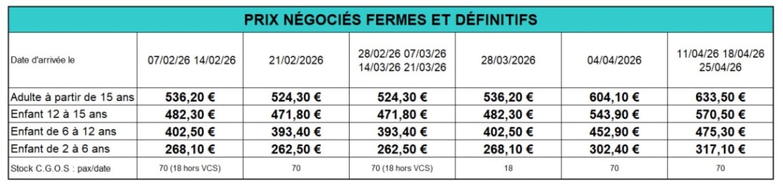 Le prix comprend : Cette formule comprend l'hébergement, l'accès aux installations du club, le linge de lit, le linge de toilette, la télévision, le wifi, la participation du C.G.O.S